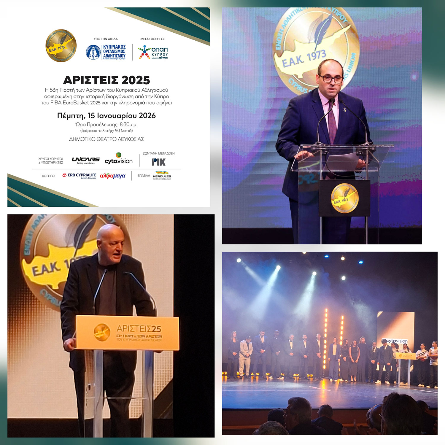 Πραγματοποιήθηκε στις 15 Ιανουαρίου 2026 , η καθιερωμένη τελετή βραβεύσεων των Αρίστων αθλητών κατά την 53 Γιορτή των Αρίστων Αθλητών της Κύπρου, αφιερωμένη επίσης στην ιστορική διοργάνωση της FIBA στην Κύπρο, του EUROBASKET 2025 και την κληρονομιά που αφήνει.